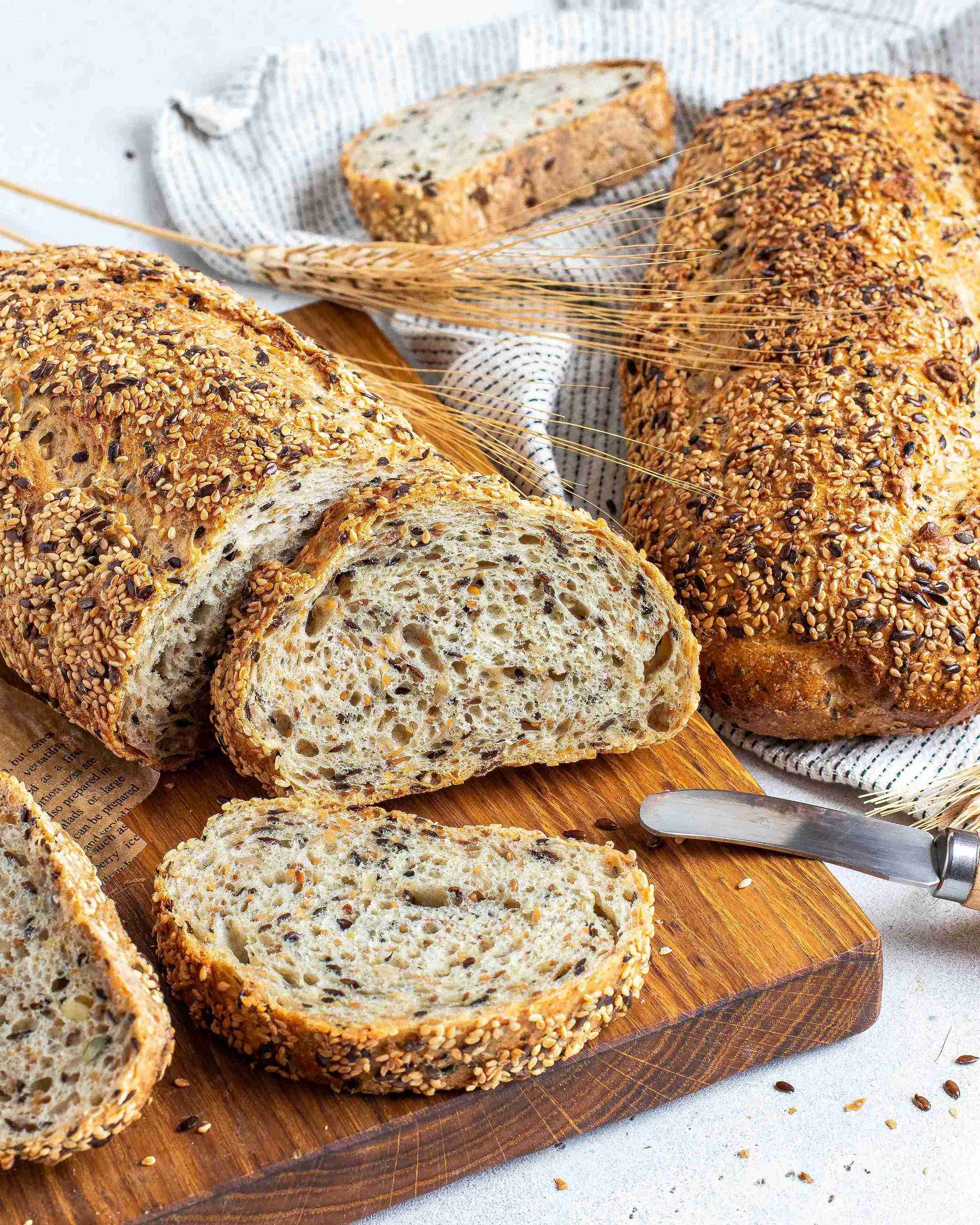 Состав: Мука пшеничная хлебопекарная высший сорт, вода питьевая, мука пшеничная хлебопекарная 1 сорт, семена льна, семена кунжута, семена подсолнечника, хлопья овсяные, ядро ореха фундука бланшированого, семена тыквы, соль поваренная пищевая [соль, агент антислеживающий (Е536)], дрожжи хлебопекарные прессованные.