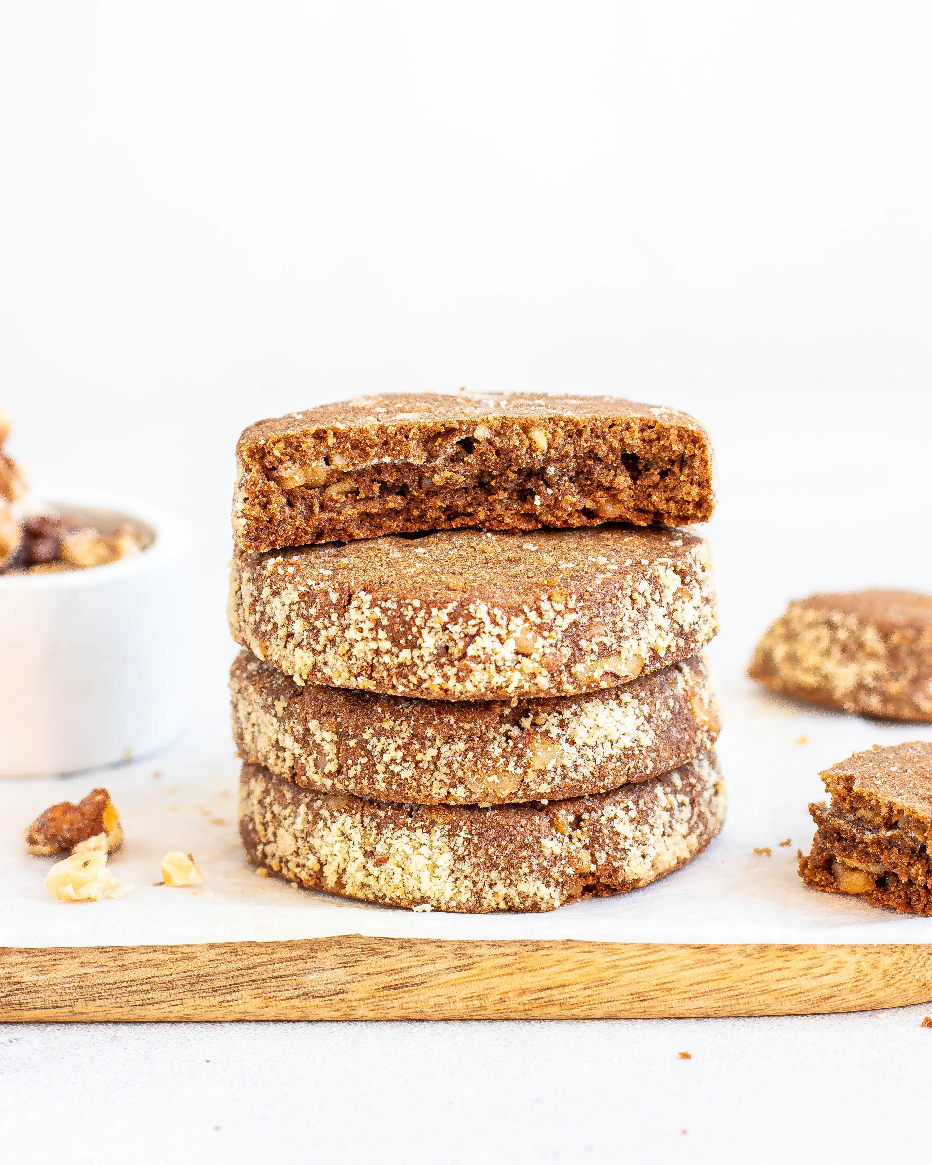 Состав: Масло сливочное [высокожирные пастеризованные сливки], мука гречневая, ядро ореха грецкого, пудра сахарная, яйцо куриное пищевое, пудра миндальная или ядро ореха миндаля тертое, экстракт солода [карамелизированный жидкий экстракт темного солода], кукурузный крахмал, соль.